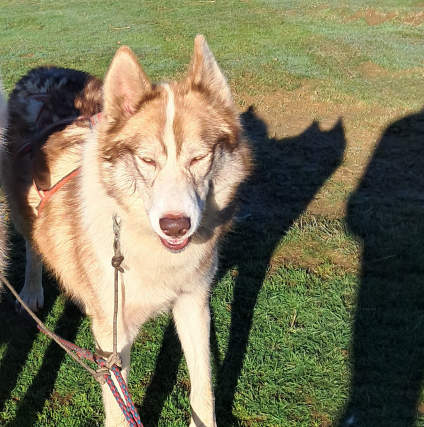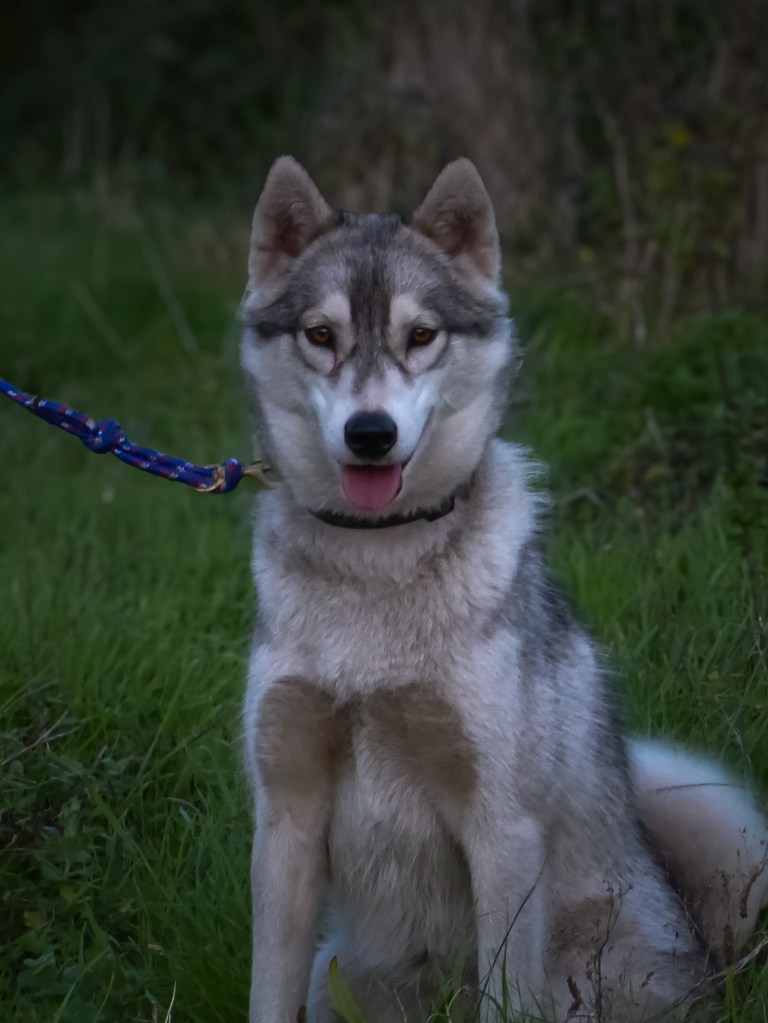 Arrivée en avril 2025 à notre retour d’expédition. Jeune chienne dynamique et très joueuse. Haute sur patte et puissante, elle est pour l’instant placée à l’arrière de l’attelage. Son caractère proche de l’Homme, lui permettra peut-être d’essayer la tête.